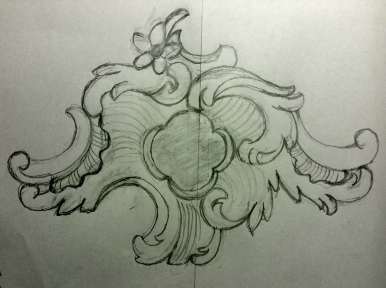 Eksempel på arbejdsproces fra tegning til færdig skæring. Skæringen er lavet til et rokoko konsolbord på Amalienborg.